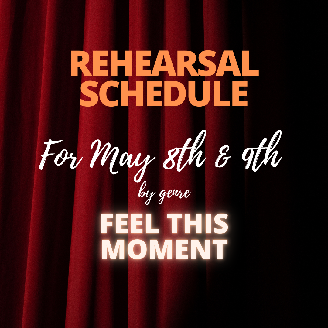 1st, check schedules below labeled “May 8th & 9th” to see which day(s) your dancer’s class(es) rehearse by rehearsal day or genre (no times listed).